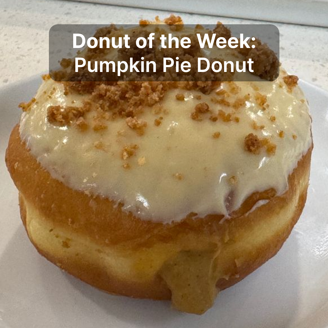 Soft, fluffy donut filled with creamy pumpkin filling, topped with smooth glaze and crumbled pie crust.