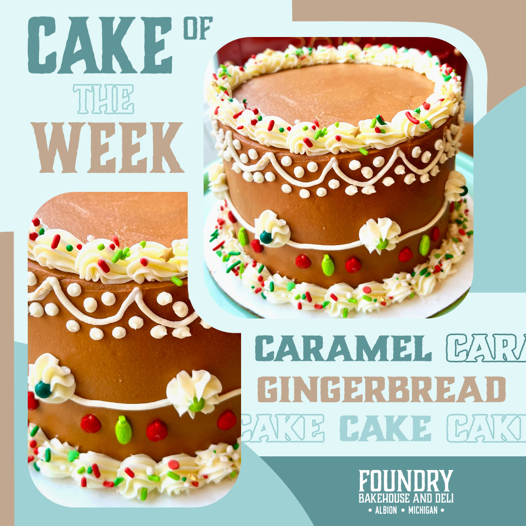 Filled with caramel and gingerbread flavors, decorated with festive frosting.