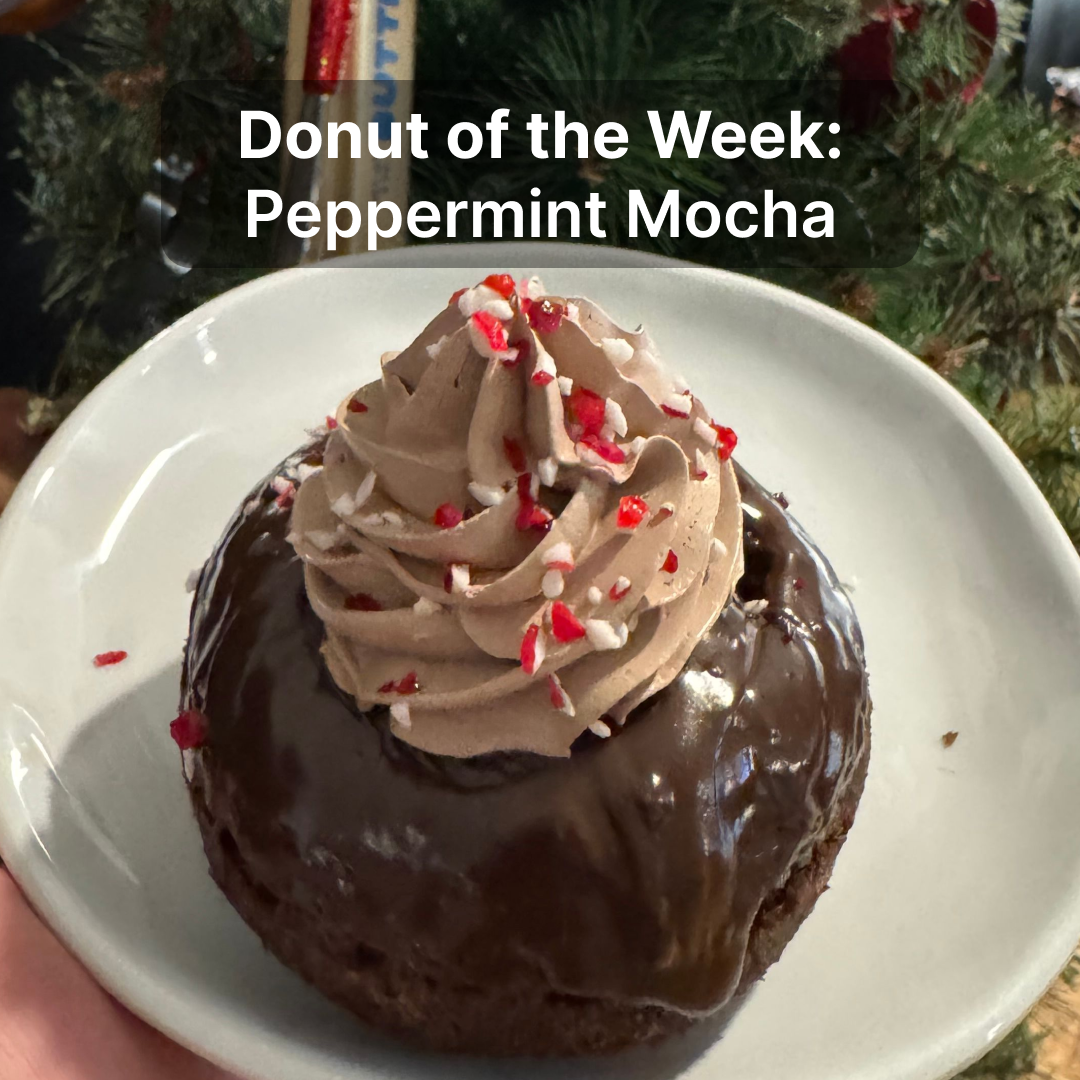 A rich chocolate donut topped with creamy frosting and sprinkled with crushed peppermint.