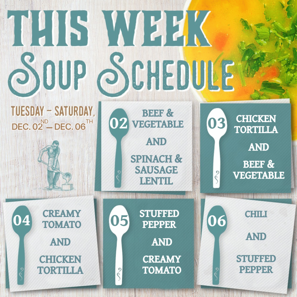 Special soups available from Dec 02 to Dec 06, Tuesday – Saturday